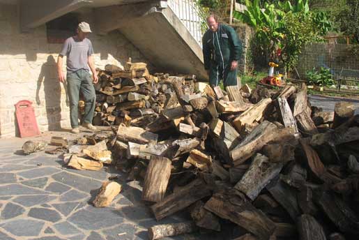 Onze winter houtvoorraad, geheel onverwacht afgeleverd, vlak voor de eerste nachtvorst.  In het voorjaar hebben we na vijf gelukkige dagen met onze cuisinière een vlam in de schoorsteenpijp gehad. Heel geestig. Veel rook, vuur en brandweermannen die ons heel behulpzaam waren bij het verwijderen van de centimeters dikke laag kool die de vorige eigenaar in het apparaat had achtergelaten. De ramoneur (schoorsteenveger) had het nog zo gezegd: haal die troep eruit, maar zo’n vaart zal ’t wel niet lopen dachten we. Inmiddels heeft Ruud alle kool verwijderd en binnenin de cuisinière brandt ’t als nooit tevoren. Met de keukendeur dicht is het hier soms om te stikken zo heet. Kortom, het werd de laatste tijd zo koud dat we besloten van ons laatst verdiende geld een kachel voor de woonkamer te kopen. Nadat we de Inter Distribution en de ramoneur tegen elkaar hadden uitgespeeld besloten we met de laatste in zee te gaan. Niet omdat hij zo goedkoop was, maar omdat hij de hele klus voor ons wilde klaren, ofwel: het transport van de loodzware kachel, het plaatsen van de elf meter lange tube en de installatie. Onze ramoneur, Frederique Malherbe, is een knappe vent met koolzwarte ogen, immer onberispelijk gekleed in blauwe overall en ook altijd vergezeld van z´n veel minder knappe maar o zo vriendelijke hulpje. Nooit komen ze op ’t afgesproken tijdstip. Geeft niet, maar het gevolg is dat ze altijd, maar dan ook altijd op ’n totaal ongeschikt moment voor de deur staan. Wanneer de kinderen naakt door ’t huis lopen bijvoorbeeld of als Ruud op de wc zit, iets dat zelfs de buren niet ontgaat. Dus wanneer je een afspraak maakt met een Franse bouwvakker reken er dan op dat hij in het gunstigste geval drie dagen later op een totaal ander tijdstip verschijnt. Echt, Hollandse stiptheid heeft hier totaal geen zin. Sterker nog, je bent pas echt ingeburgerd als je zelf ook te laat komt op afspraakjes of (beter nog) helemaal niet op komt dagen en weken later onaangekondigd komt binnenvallen. Maar goed, bij hun laatste bezoek kwamen ze dus om de schoorsteen te controleren. Toen stond ik in avondkleding de muur uit te hakken, dat kan zomaar gebeuren.