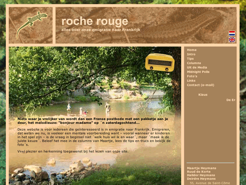 Rocherouge is oorspronkelijk gestart als Google blogspot om familie en vrienden te informeren over onze emigratie naar Frankrijk, maar omdat het aantal lezers dagelijks toenam besloten we een eigen site op te zetten die ons meer mogelijkheden zou geven een wereldpubliek te bereiken. De naam ‘rocherouge’ (rode rots) is door ons gekozen ter ere van de rode rots achter het huis.